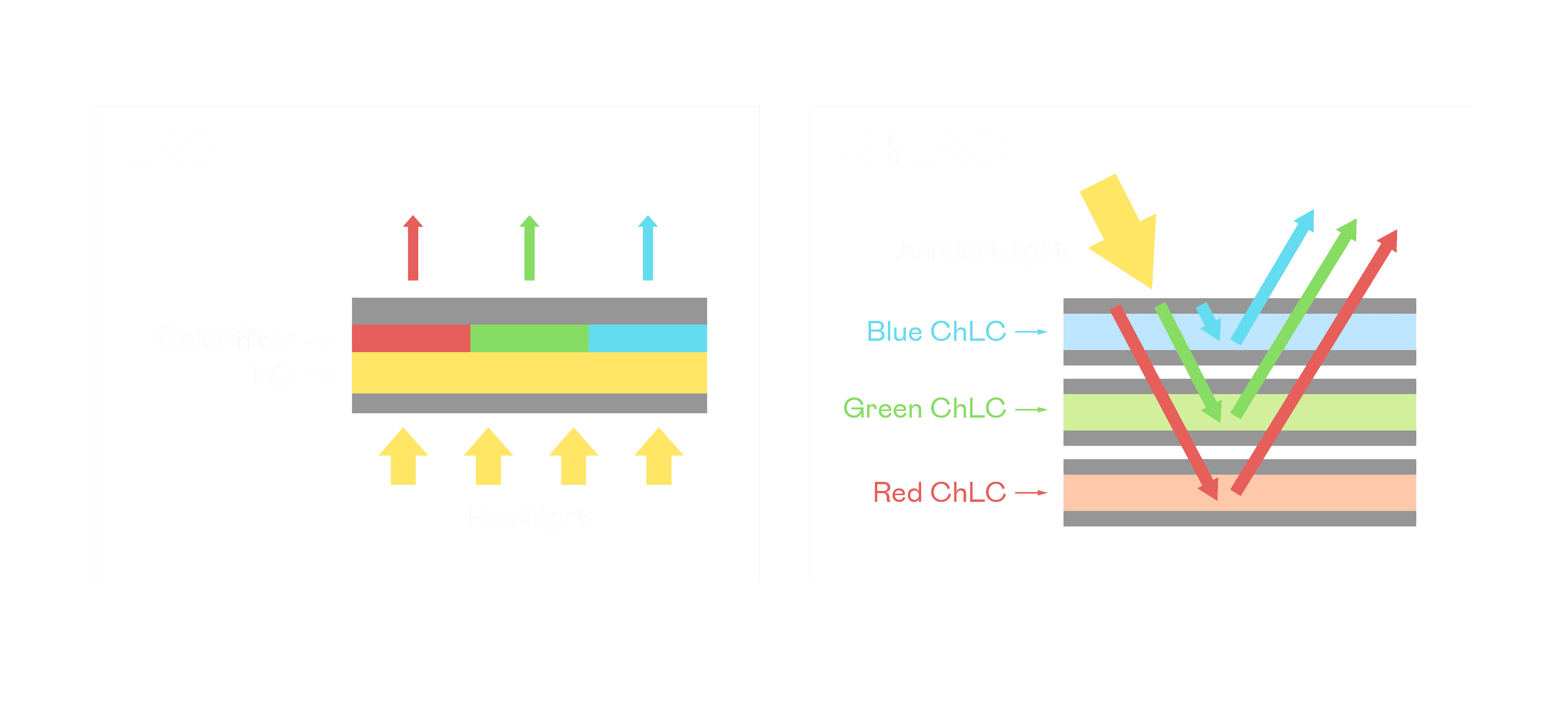 CG电子胆固醇液晶显示器是由红、、、绿、、蓝三层胆固醇液晶面板堆叠而成,,并采用无彩色滤光片设计,,减少环境光在反射过程中的损耗。。