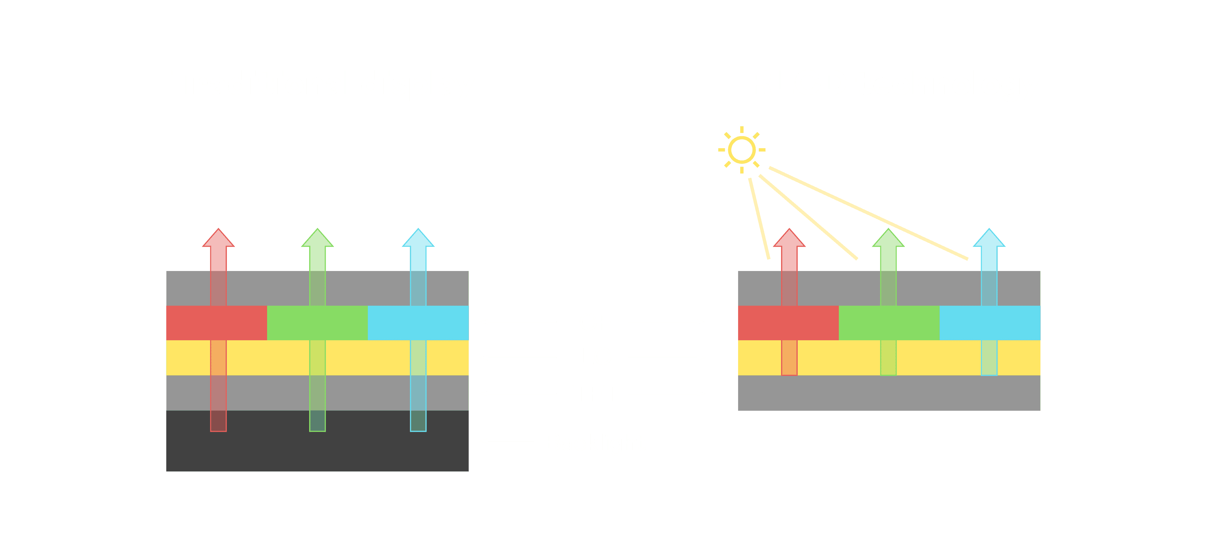 与传统需搭配背光单元的液晶显示相比,,反射式液晶技术不仅更省电、、、更轻薄,,,,且即便在艳阳下仍能清晰显示。。。。此外,,,少了背光单元,,,,也大幅降低了 LED 蓝光伤害眼睛的疑虑。。。