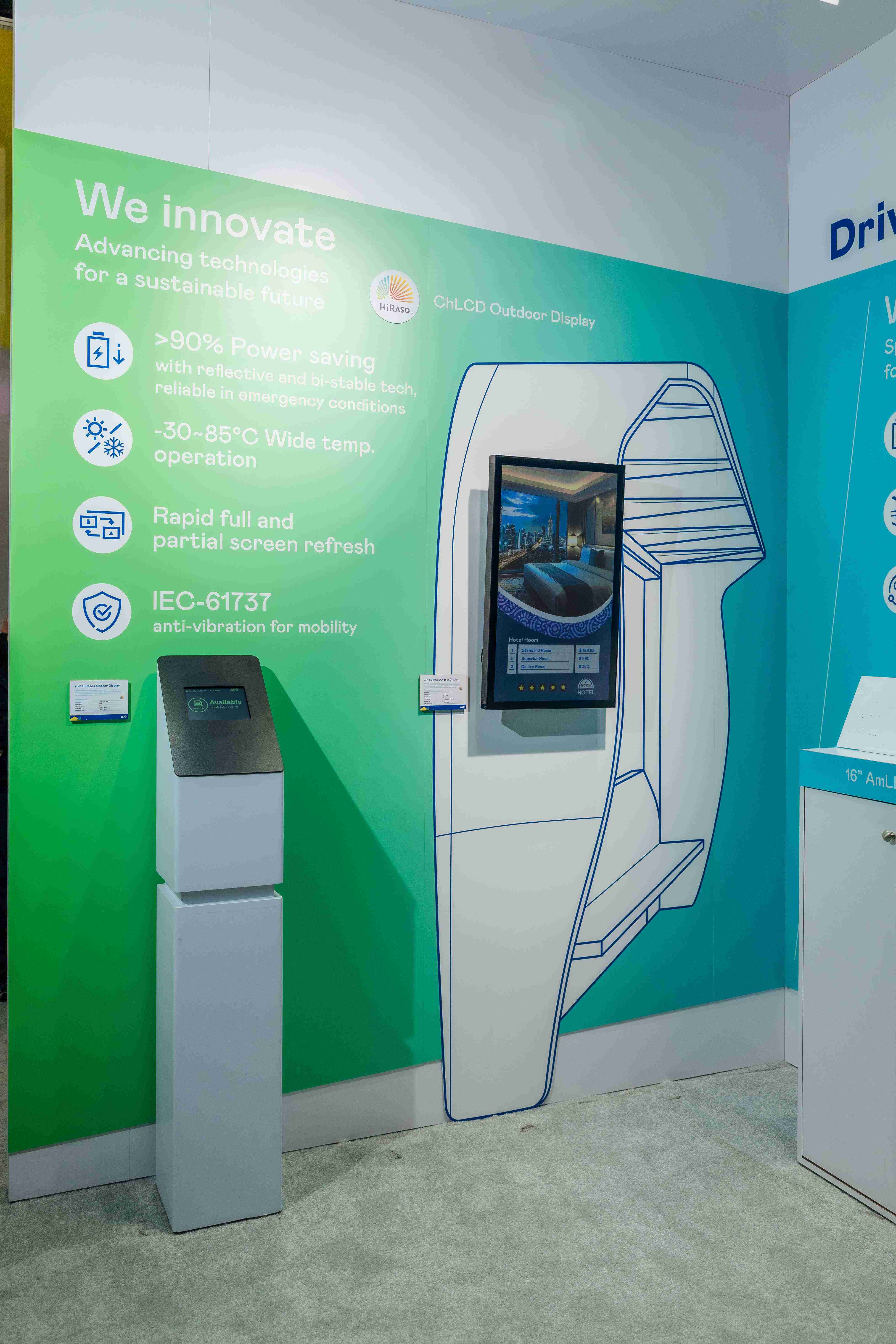 HiRaso胆固醇液晶显示器运用反射环境光线的方式,,,呈现影像显示时零耗能的环保省电诉求,,,光线愈强愈能呈现绝佳的色彩饱和度及显示效果,,同时在摄氏-30度至85度间宽温的使用优势,,,,为户外电子看板的新首选。。。