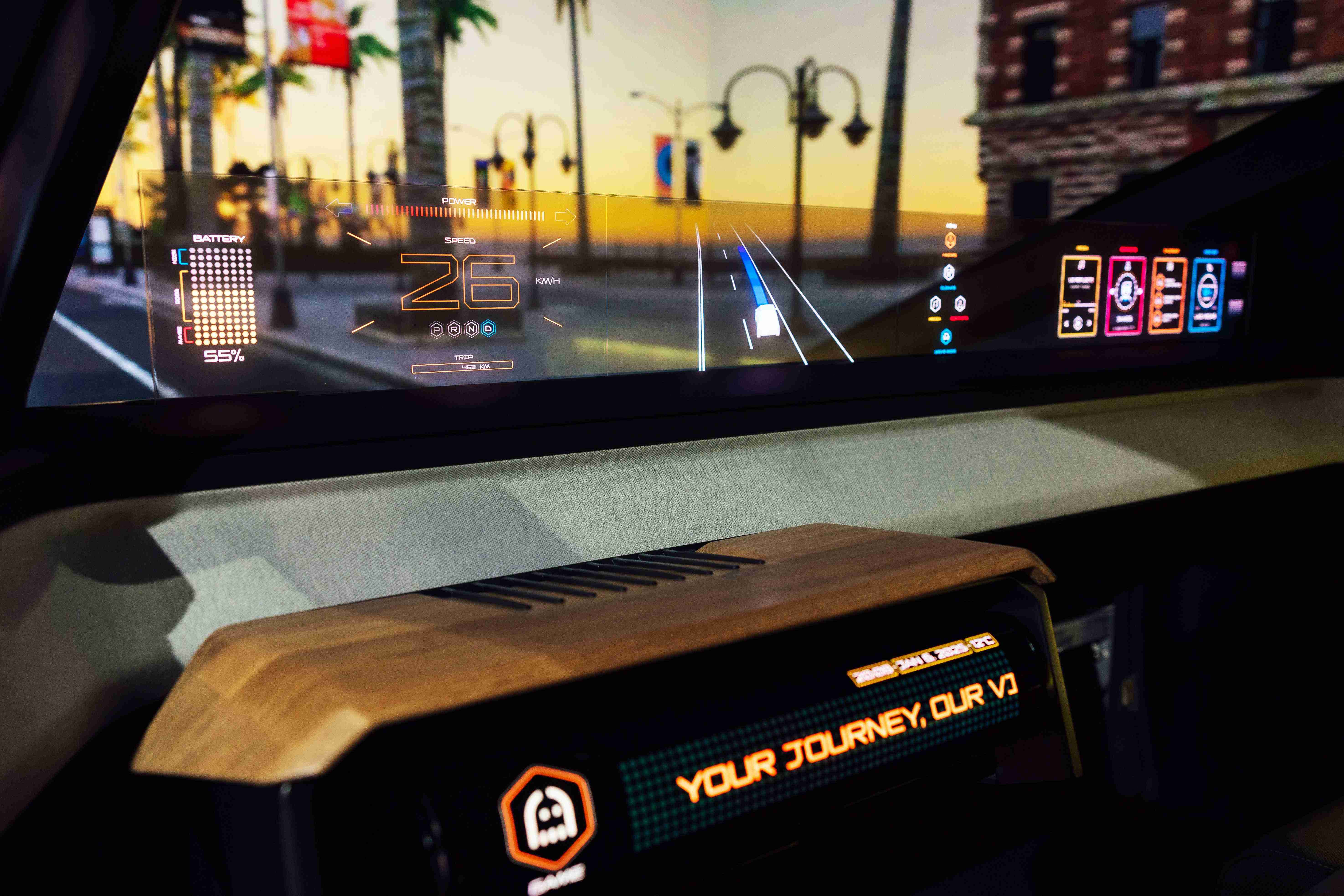 隐藏式智驾介面(Foldable Cruise Pilot)在不同模式下可以切换显示方式,,,,在手动驾驶模式时,,显示器可以在半收合状态下,,,仍呈现所需资讯;自驾模式时,,显示器可以完全展开,,,,满足不同的多媒体娱乐需求。。 CG电子Smart Cockpit 2025 在车头及车尾搭载合作伙伴Ennostar开发的互动式矩阵显示器(Interactive Matrix Display),,其突破传设计框架,,利用优化的光源整合技术,,提供更高亮度与对比度的显示效果,,,,营造驾车者个性化风格并传递讯息。。。。